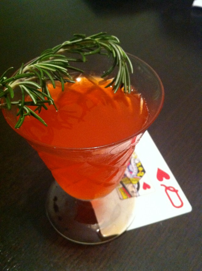 Uno de los problemas más frecuentes de la coctelería casera es qué hacer con los licores llamémosles «secundarios». Si tienes ginebra, le echas tónica. ¿Ron? A buscar menta y limas al súper. ¡Y el vermut va con todo! Aunque ni el gin tonic, ni el mojito, ni el vermut con sifón serían quizás los cócteles más imaginativos del universo, oye, pues bien preparados, lo ricos que están. Pero ¿qué hacer con esas cosas algo más raras que hemos comprado por impulso o nos hemos traído de un viaje? Del cóctel de hoy me gusta que utiliza dos de esos ingredientes menos frecuentes (aunque tampoco tan infrecuentes como para no estar en ningún mueble bar casero), el Aperol y el St. Germain. Me gusta también que es un cóctel muy aromático con dos sabores contrastados, y de bajo contenido alcohólico. La versión original, que saqué del libro The art of the shim. Low-Alcohol cocktails to keep you level, aún fue rebajada más por mí cuando decidí sustituir por sirope de saúco el St. Germain tras cierto incidente algo gore con una botella que se negaba a abrirse. Tirita en el dedo mediante, mi pérdida de dignidad quedó olvidada gracias a la belleza de este combinado. Además, por pura carambola tenía en la nevera la ramita de romero que lleva como decoración y que hace las veces de removedor perfumado. Un cóctel elegante, fresco, y como su nombre indica, de lo más aparente: todo un éxito.